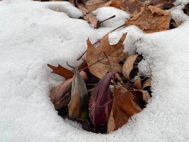 It’s still winter—ten more days until the vernal equinox!—and the ground is still frozen and mostly blanketed in snow and ice. Skunk cabbage is undeterred. It has a rare trait—thermogenesis—where it creates its own heat, melting through the ice and snow, ready to bloom no matter what this spring brings.